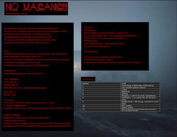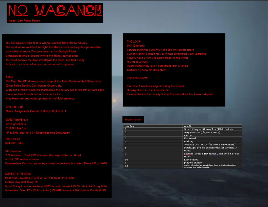 You are travelers who took a wrong turn into Black Hollow County. The road in has vanished. At night, the Things come out—grotesque monsters and cultists in robes. The only haven is the Starlight Motel, a dilapidated strip of rooms where the Things cannot enter. You must survive the days, investigate the town, and find a way to break the curse before you are torn apart or go mad.